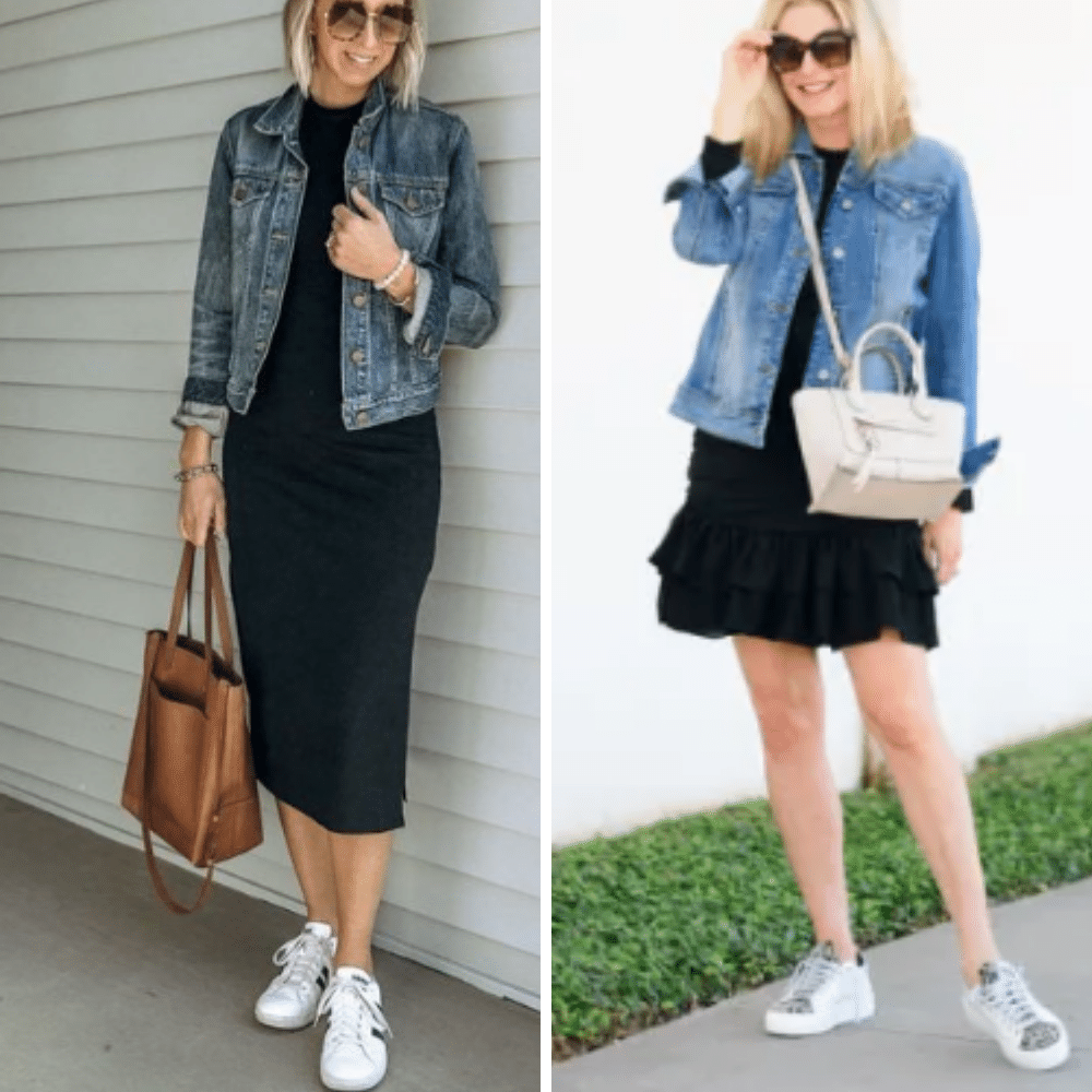 Another great way to style a black dress is with a denim jacket and sneakers. This look is perfect for errands or running around town. It's comfortable but still put-together.