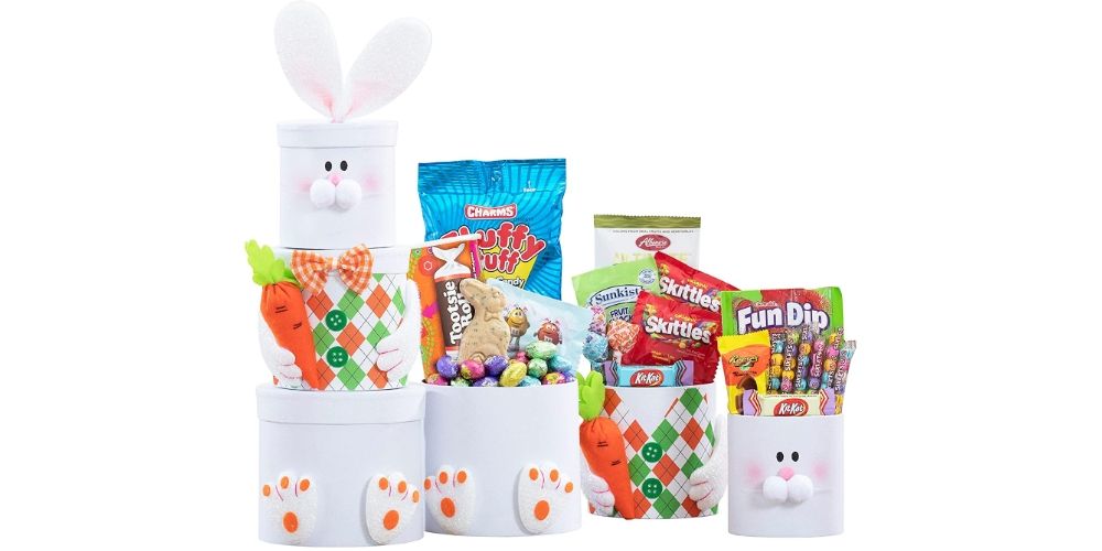 This tower of Easter treats will satisfy any sweet tooth. Filled with chocolate bunnies, jelly beans, and more, it's perfect for an Easter egg hunt or as a sweet surprise for the family.