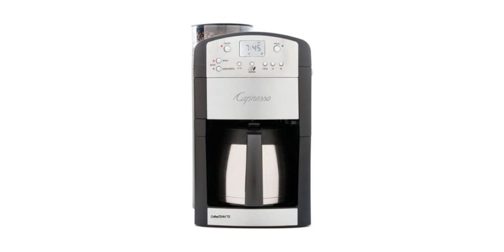 The Capresso 465 CoffeeTeam TS 10-Cup Digital Coffeemaker is also extremely easy to clean thanks to its removable water tank and filter basket. You won't have to deal with frustrating grinds either, thanks to the off-center grinder design. Rest easy knowing the minimal noise from grinding the beans will be worth the heavenly aroma of freshly brewed coffee in the air.