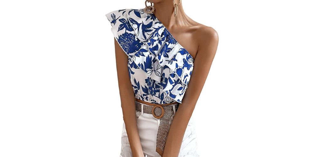 This enchanting top showcases a captivating floral print that's bound to make heads turn, while the one-shoulder and ruffle trim detailing lend it a delightful boho-inspired vibe. Crafted from a lightweight, breezy fabric, this top ensures you stay cool and comfy during warm weather. Its crop length is just perfect for teaming up with high-waisted jeans or shorts, truly celebrating the beauty of crops. To bring the whole look together, we recommend adding a striking statement necklace, fashionable oversized sunglasses, and your much-loved strappy sandals for a picture-perfect ensemble.