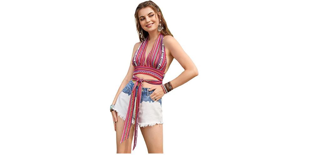 Made from a comfy blend of polyester and spandex, this top features a chic halter neck design and back tie closure. Customers rave about the stretchy fit and versatility of this top. One reviewer even called it a "cute hippy top." Whether you pair it with high-waisted jeans and sandals for a casual day out or dress it up with a midi skirt and heels for a night out, this top is sure to turn heads. Accessorize with layered necklaces and statement earrings to complete the look.