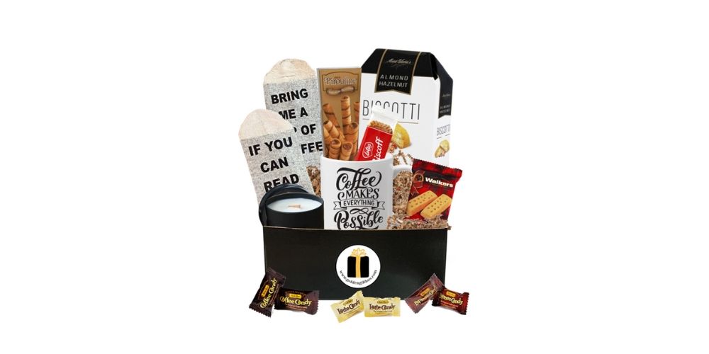 If you're a coffee lover or know someone who is, you'll want to check out these premade easter baskets from Golden Gift Box. A gift set is jam-packed with goodies in a keepsake reusable box for any coffee aficionado. Included are gourmet cookies for when you need a sweet treat to go with your morning cup of joe. And for those times when you're craving something a little more savory, there are coffee candy and sausage links from Zuke's Lil Links. But wait, there's more! The Coffee Lover's Basket also comes with a fun bistro-style coffee mug and novelty coffee socks to keep your feet and tummy warm. And if that's not enough to get you excited, there's even a Twisted Coffee Wax Melt from The Scent Salon to tempt your taste buds.