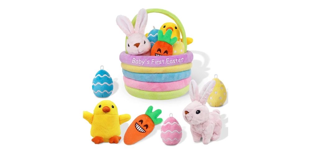 This delightful Easter Basket Playset is an ideal gift for special littles celebrating their first holiday! Filled with sounds and fun, the set comes complete with a snuggly bunny, a board book about Easter cheer, plus colorful eggs ready to play. Little ones will love hearing carrots crinkle as they pinch it; bunnies & chicks squeak when squeezed; and bright egg rattling away in delight. Don’t miss this must-have opportunity to give your young one cherished memories of their very own Baby's First Easter!