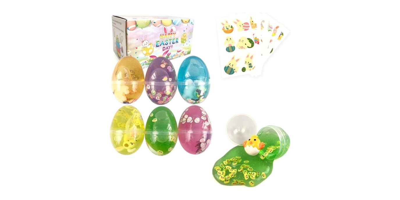 A fun and entertaining gift for kids and adults, Easter egg slime comes in Easter egg shapes, making it a perfect Easter gift. It's also a great stress-reliever. With six packs of egg-shaped slime and six animal stickers, each egg slime even comes with a toy inside like a rabbit or chick, providing hours of fun. Unlike other slime products, this slime is less sticky, providing great consistency and an amazing texture that is not crumbly and dry.