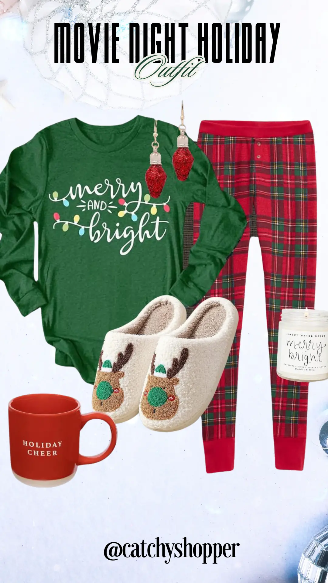 Begin your holiday mornings enveloped in comfort and style with this charming ensemble. Designed to infuse a sense of festive cheer right from the start of your day, this outfit is the epitome of relaxed holiday elegance. Ideal for those cozy mornings spent at home, it offers a delightful blend of comfort and festive fashion, ensuring you feel both comfortable and cheerfully stylish as you revel in the holiday spirit.