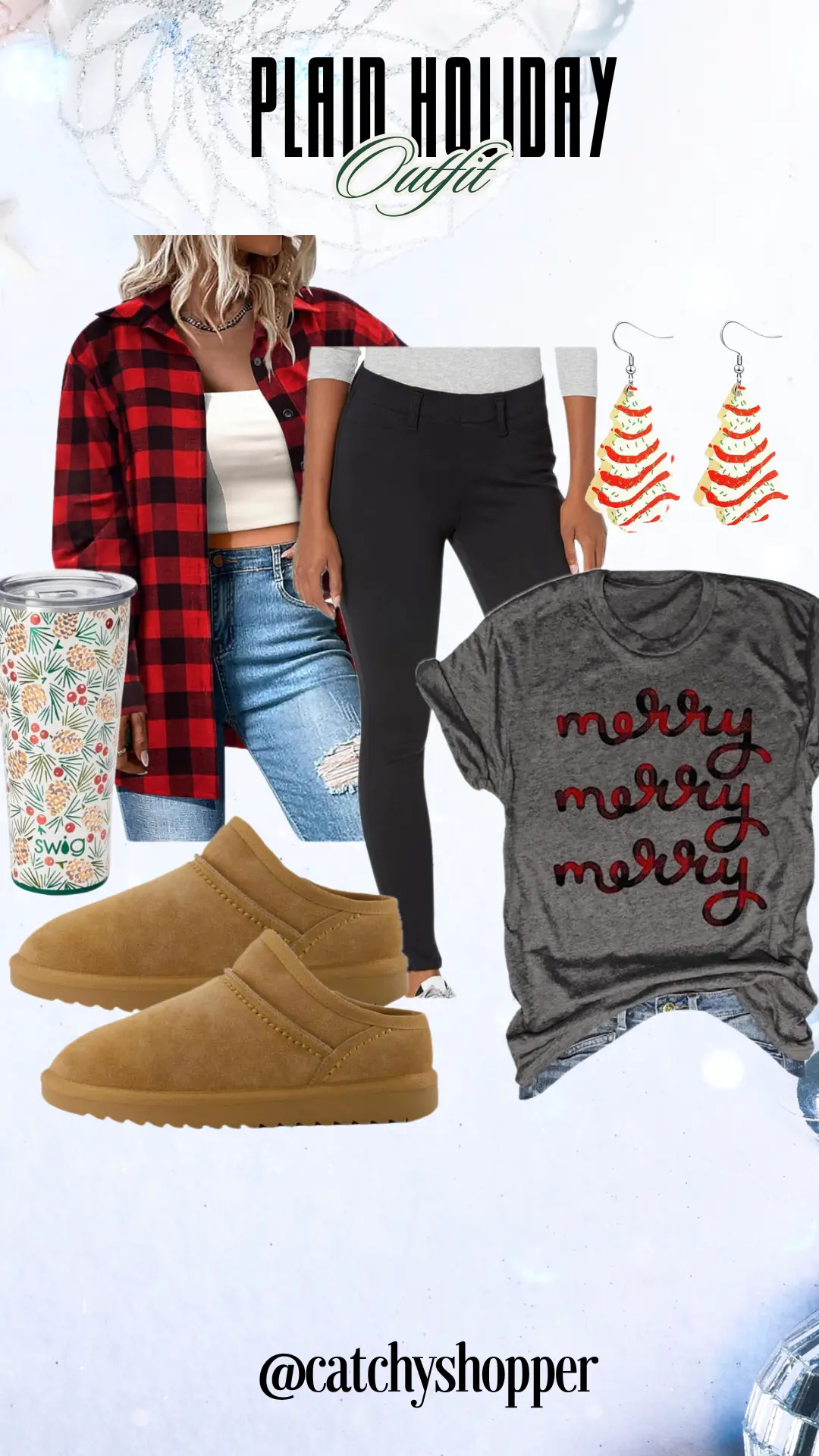 This cozy yet chic outfit is perfect for festive occasions. It combines a snug t-shirt and a vibrant plaid shirt with classic jeans. Elegant earrings, comfortable mules, and a handy tumbler add playful and stylish touches, creating a merry and fashionable holiday look.