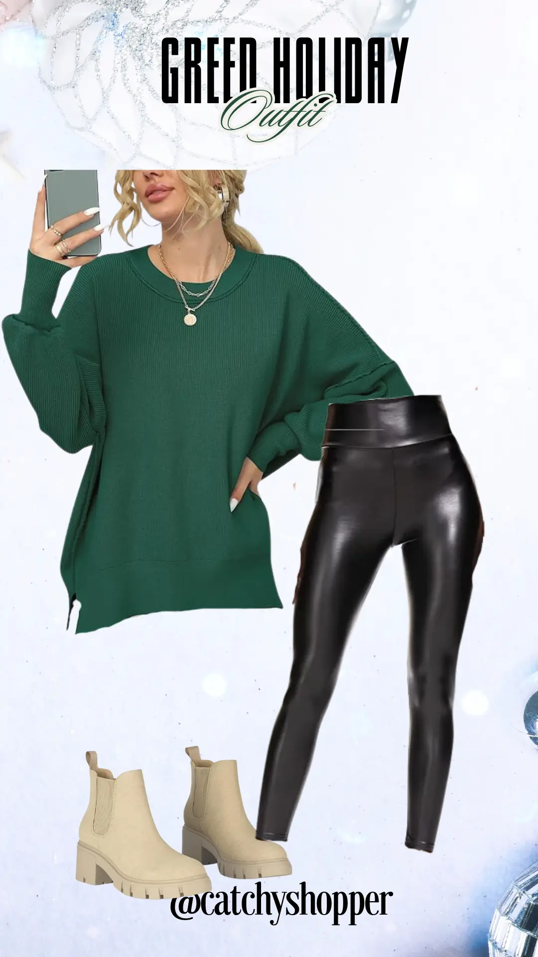 Go for a classic holiday look with this green-themed outfit. It's comfortable yet stylish, ideal for a variety of holiday occasions.