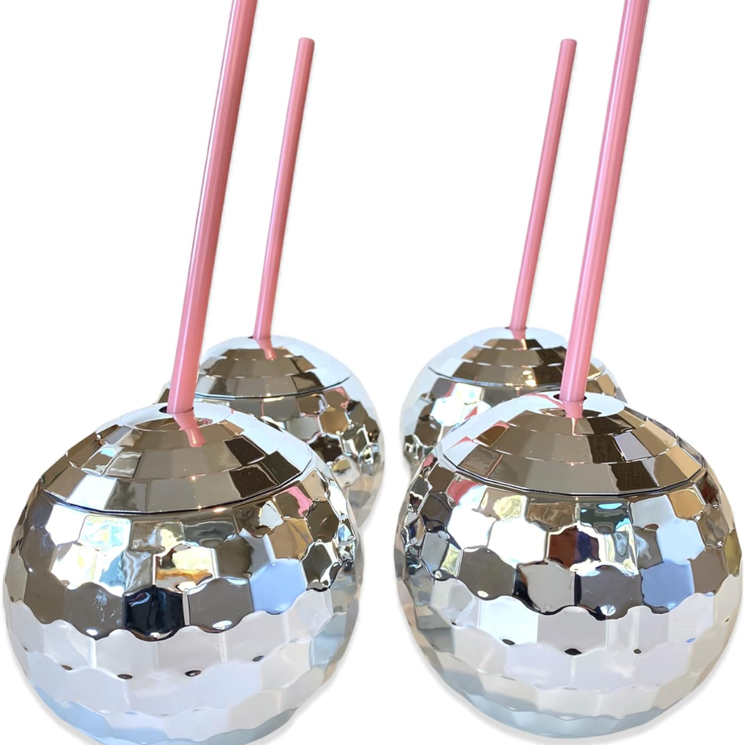 Drink in style with these unique Disco Ball Cups with Pink Straws, adding a pop of color and disco charm to your party.