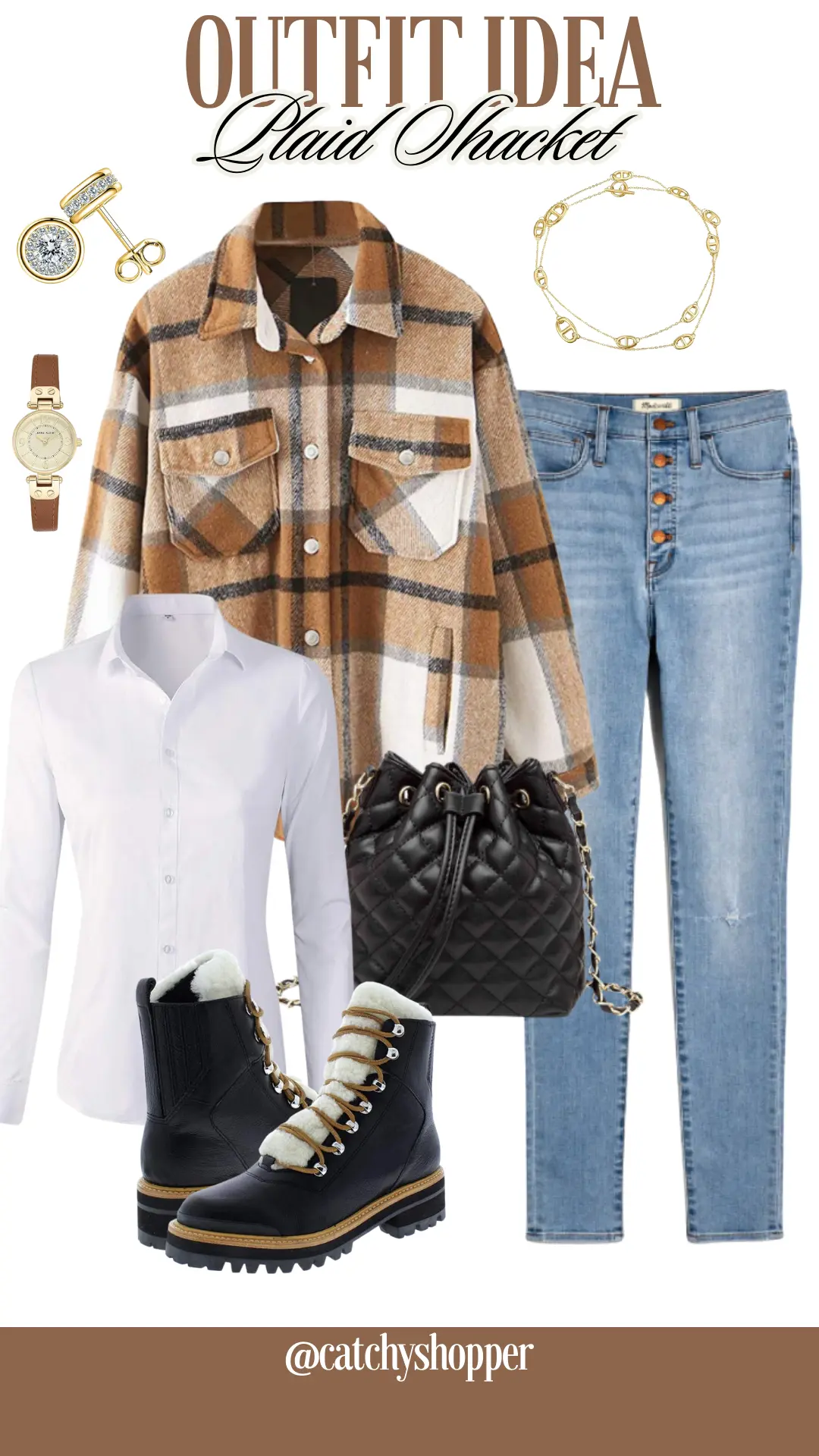 Embrace classic elegance by tucking a crisp white button-down shirt into blue high-waisted skinny jeans. Layer it with a deep-hued oversized plaid shacket to add a touch of rustic charm. Complete the ensemble with ankle booties, layered gold necklaces, and a versatile leather bag for a look that's effortlessly chic.