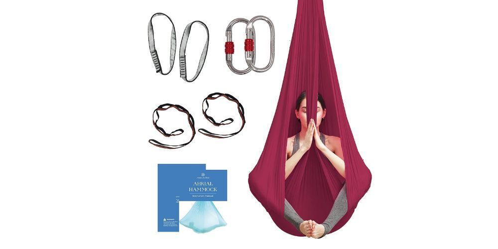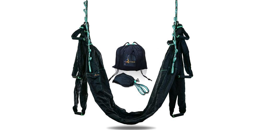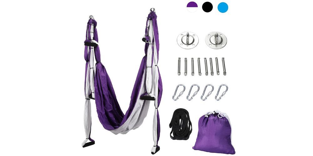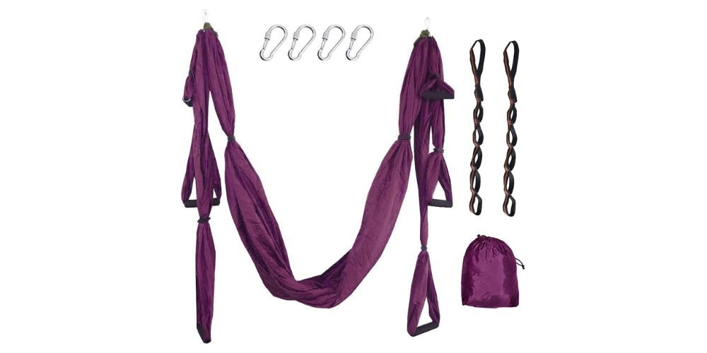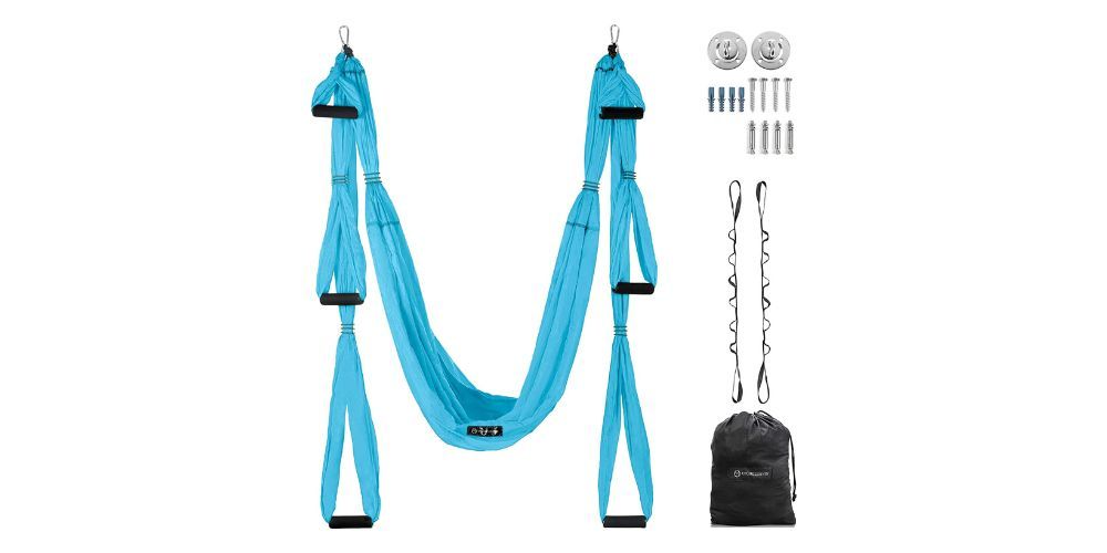 One of the best things about this yoga trapeze is its easy setup. You can hang it in minutes from a chin-up bar, beam, or solid tree branch. Plus, it comes with rubber handle grips, adjustable straps, gym-grade carabiners, and a stylish carrying bag. However, be aware that ceiling hooks and stands are sold separately.